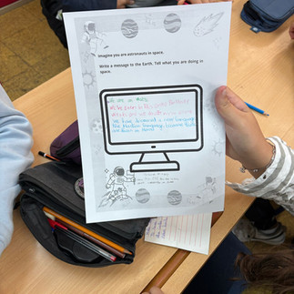 Posteriormente, se trabaja la comprensión lectora a través de la técnica cooperativa 1-2-4, combinando trabajo individual, en pareja y en grupo para contrastar respuestas y mejorar la comprensión. Como cierre, se desarrolla una actividad creativa cooperativa en la que los alumnos imaginan que son astronautas y redactan un mensaje a La Tierra, integrando lo aprendido. La sesión finaliza con una puesta en común y el refuerzo guiado de las estructuras del Present Perfect y de las estrategias de comprensión lectora.